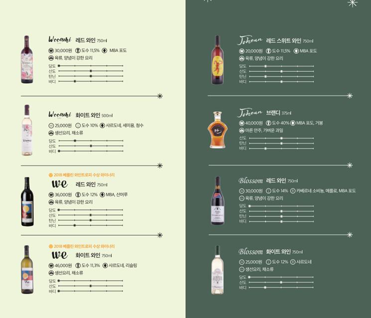 *까치락골 화이트 및 레드: 지역에서 생산된 와인으로, 다양한 맛을 제공합니다